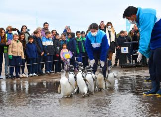 Once pingüinos rescatados regresan al mar en Argentina, en presencia de...