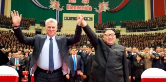 El líder norcoreano Kim Jong-un y el presidente de Cuba Miguel Díaz-Canel — quienes esperan librarse de las sanciones económicas de...