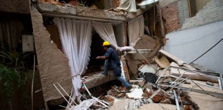 Con el casco puesto, Rodrigo Díaz Mejía se alza sobre un automóvil aplastado y se encarama hasta llegar a un apartamento...