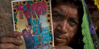 La madre escarba entre las cosas guardadas en un enorme baúl de metal, buscando una foto de su joven hija,...