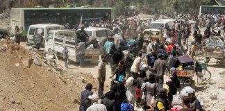 Autobuses, ambulancias y camiones se alineaban hoy a la entrada de un suburbio de Damasco que lleva un largo tiempo bajo asedio, para...