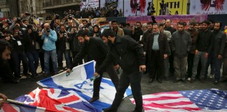 Miles de iraníes incendiaron la bandera estadounidense y corearon el miércoles mientras celebraban el aniversario de la toma de la embajada de Estados...