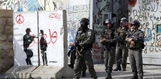 Palestinos enmascarados arrojaron piedras a los soldados, que responden con...