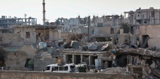 Cuadras de edificios bajos sin fachadas, concreto destrozado, calles llenas de escombros y restos retorcidos de automóviles y camiones forman el paisaje en...