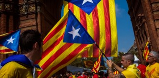 Muchos lucían camisas con la inscripción "Ahora es el momento" y clamaban "¡Independencia!" en catalán al engrosar...