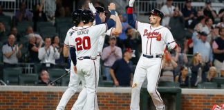 Matt Olson conectó un sencillo con dos outs en el 14to inning, para que Marcus Siemien anotara la carrera que...