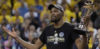 En plena celebración, LeBron James dio un largo abrazo y felicitó a Kevin Durant antes de salir de...