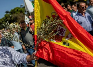 Miles de agricultores de aceitunas marcharon hoy por la capital española para protestar por los bajos precios y exigir protección ante los aranceles...