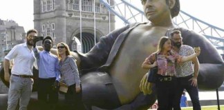 Londinenses y turistas quedaron pasmados por igual al ver una enorme estatua de Jeff Goldblum con el pecho descubierto junto al emblemático Puente...