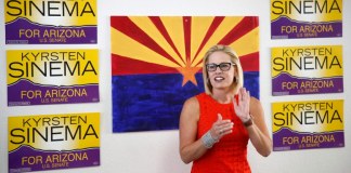En una sala de conferencias, la candidata republicana al Senado por Arizona Martha McSally pregunta a los directivos de una pequeña...