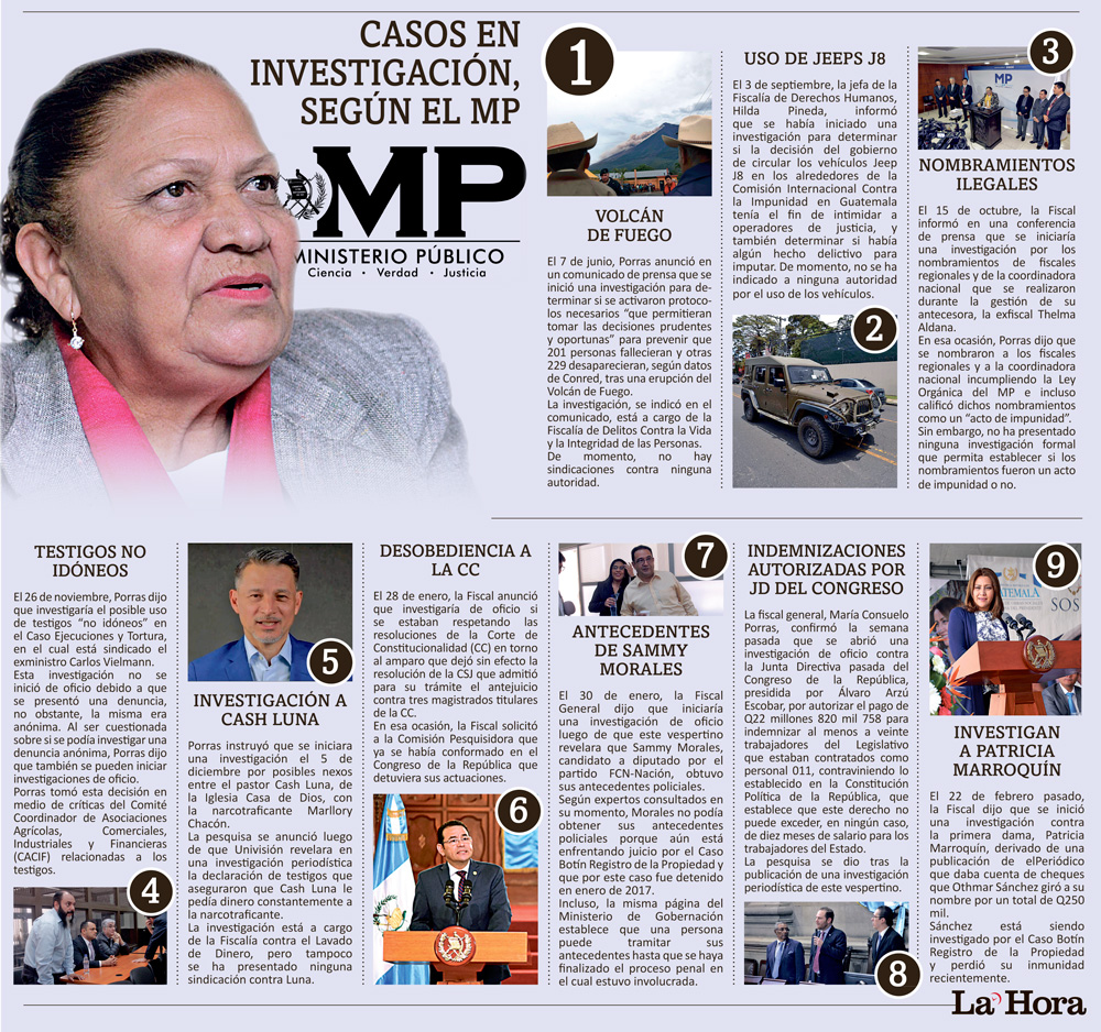 La Hora consultó a Julia Barrera, portavoz del MP, para conocer una postura de la institución ante lo dicho por los analistas y en general por los avances de las pesquisas que se han anunciado, y recordó que tienen la facultad en ley para iniciar de oficio las investigaciones para establecer la comisión de un hecho delictivo.