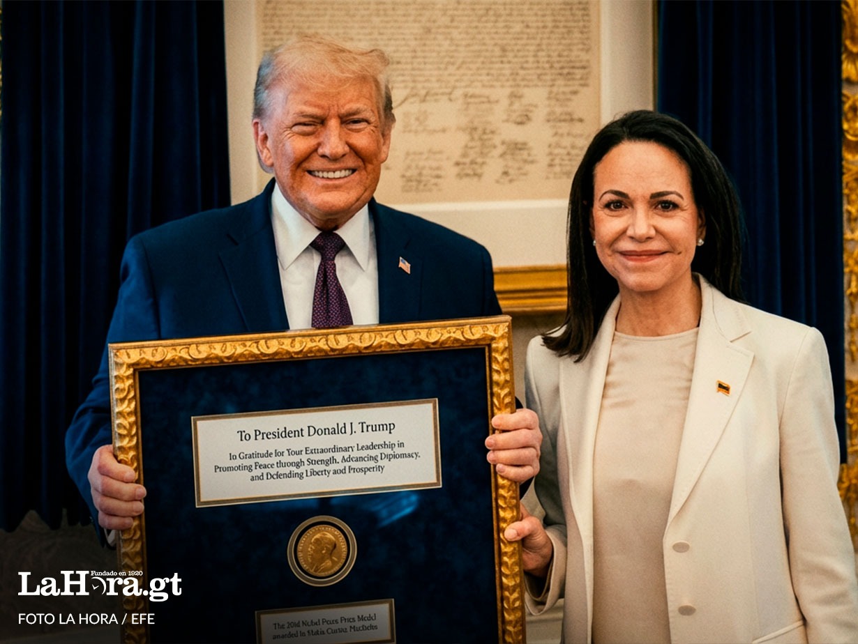 Corina Machado entregando el premio Nobel a Donald Trump. Foto La Hora: EFE