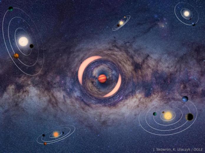 Impresión artística de un planeta errante que produce microlentes gravitacionales en una estrella distante en el centro galáctico. La mayoría de los planetas conocidos orbitan estrellas en sistemas gravitacionalmente ligados. Crédito: J. Skowron, K. Ulaczyk / OGLE/EFE