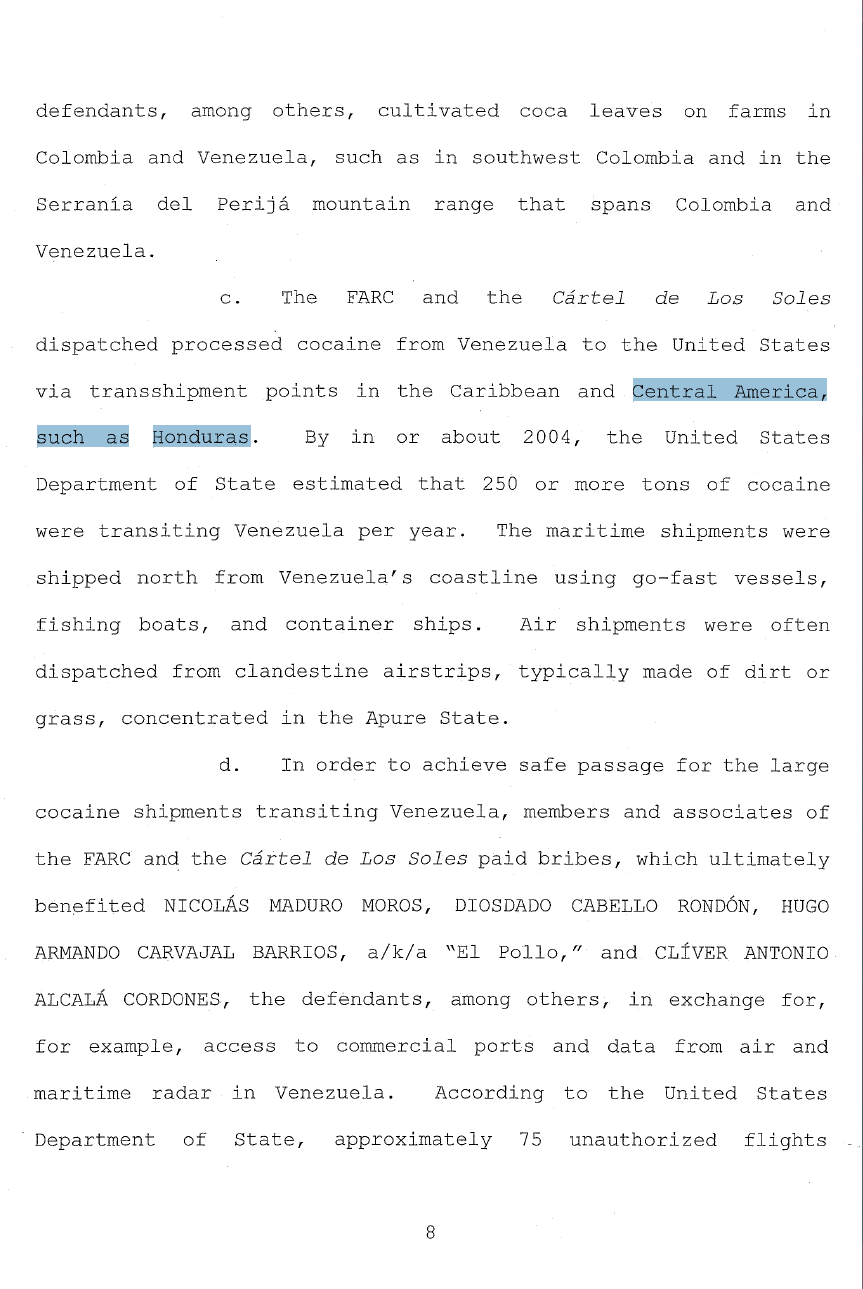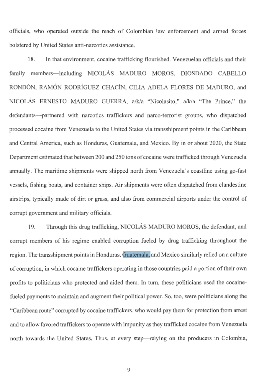 La reciente versión puntualiza que el esquema era que Maduro y otros acusados se habrían asociado con narcotraficantes y grupos narcoterroristas, quienes enviaban cocaína procesada desde Venezuela a Estados Unidos a través de puntos de transbordo en el Caribe y Centroamérica, como Honduras, Guatemala y México.