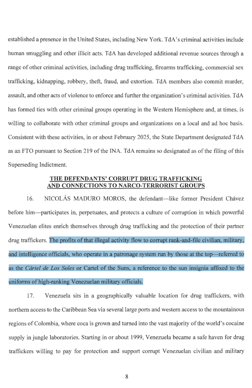 Continúa asegurando que «desde 1999 hasta 2020, el Cártel de Los Soles fue una organización narcotraficante venezolana compuesta por altos funcionarios venezolanos que abusaron del pueblo venezolano y corrompieron las instituciones legítimas de Venezuela para facilitar la importación de toneladas de cocaína a Estados Unidos».