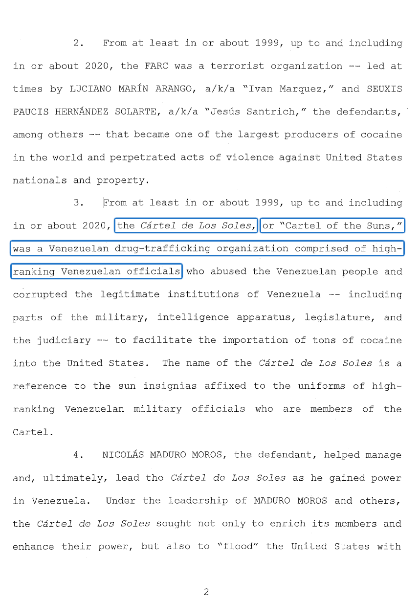 La acusación anterior de 2020, que aparece reescrita actualmente, asegura que Nicolás Maduro Moros y otras personas, habrían participado en una conspiración narcoterrorista corrupta y violenta entre el Cartel de Los Soles de Venezuela y las Fuerzas Armadas Revolucionarias de Colombia (FARC).