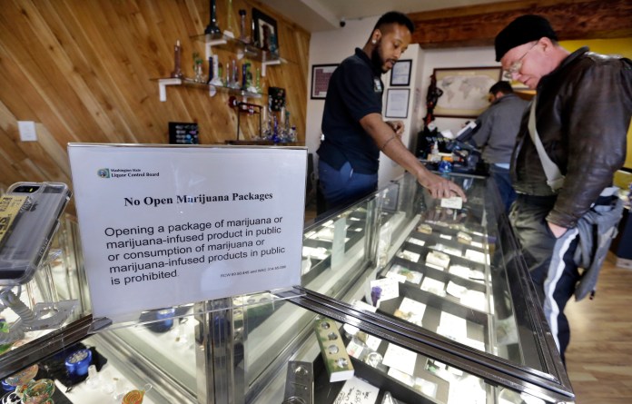 Will Bibbs (izq) asiste a un cliente en Cannabis City, negocio de venta legal de marihuana de Seattle, el 30 de diciembre del 2014. Cada vez más bancos y cooperativas de crédito están aceptando dinero de estos comercios, algo que hasta hace poco se negaban a hacer por temor a ser acusados de lavado de dinero en vista de que la venta de marihuana sigue siendo considerada ilegal por el gobierno federal. (AP Photo/Elaine Thompson, File)
