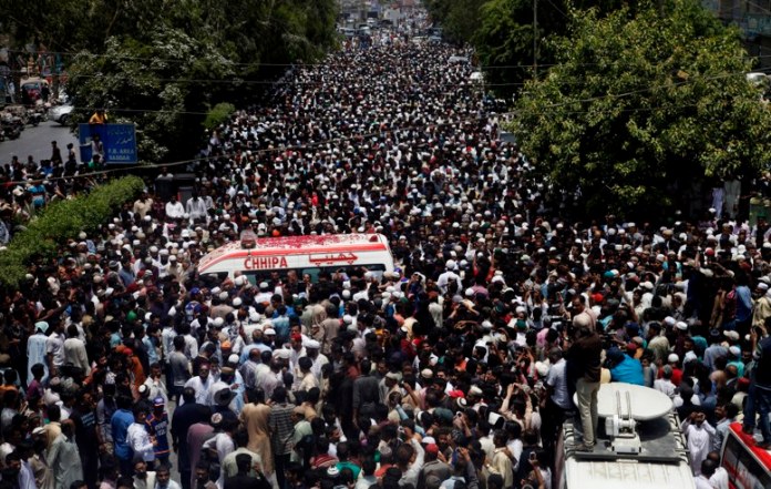 Imágenes de televisión mostraban a llorosos dolientes que lanzaban pétalos de rosa sobre la ambulancia que transportaba el ataúd de Amjad Sabri, cuyo auto fue emboscado por hombres armados el miércoles, antes de una comparecencia organizada en una televisora local.