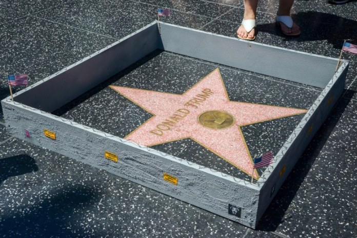 Alrededor de esa estrella apareció esta semana un pequeño muro gris de 15 centímetros de alto, con alambre de púas y pequeñas banderas estadounidenses.