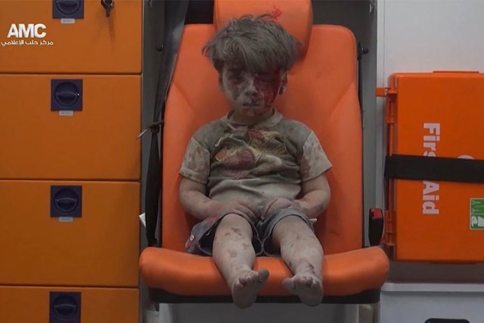 La imagen del pequeño, aturdido y cansado, sentado en la silla naranja de una ambulancia, cubierto de polvo y con sangre en la cara, pone cara al horror de la guerra en la ciudad del norte del país y se ha compartido ya miles de veces en medios sociales.
