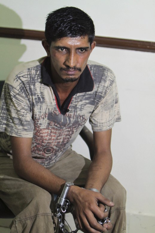 Los grilletes que tiene colocados Rajhu parecen demasiado pesados para sus pequeñas muñecas. Chocan entre sí y hacen un fuerte ruido metálico cuando se mueve durante una charla.