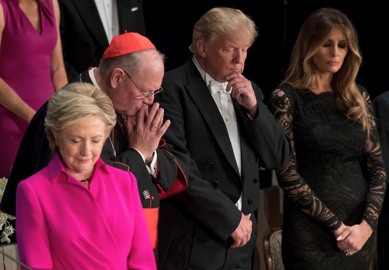 Trump y Clinton se sentaron durante la cena en el Hotel Waldorf Astoria muy cerca uno del otro, apenas separados por el arzobispo de Nueva York, el cardenal Timothy Dolan, e incluso intercambiaron algunas pocas palabras.