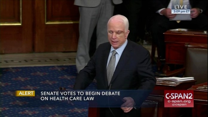 En un conmovedor y apasionado discurso, McCain, de 80 años y con una larga cicatriz sobre el ojo tras su operación, llamó a todos los senadores a trabajar por un resultado más allá de los enfrentamientos partidistas. «¡Amigos, así no conseguiremos regular nada!»