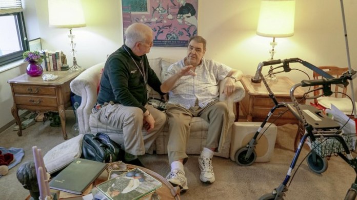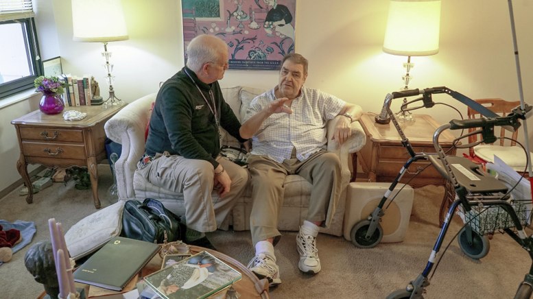 Uno de sus pacientes, Marvin Shimp, de 87 años, ve muy poco pero vive independientemente. Dobschuetz corrobora periódicamente sus signos vitales y le hace preguntas, asegurándose de que está en condiciones de permanecer en su casa.