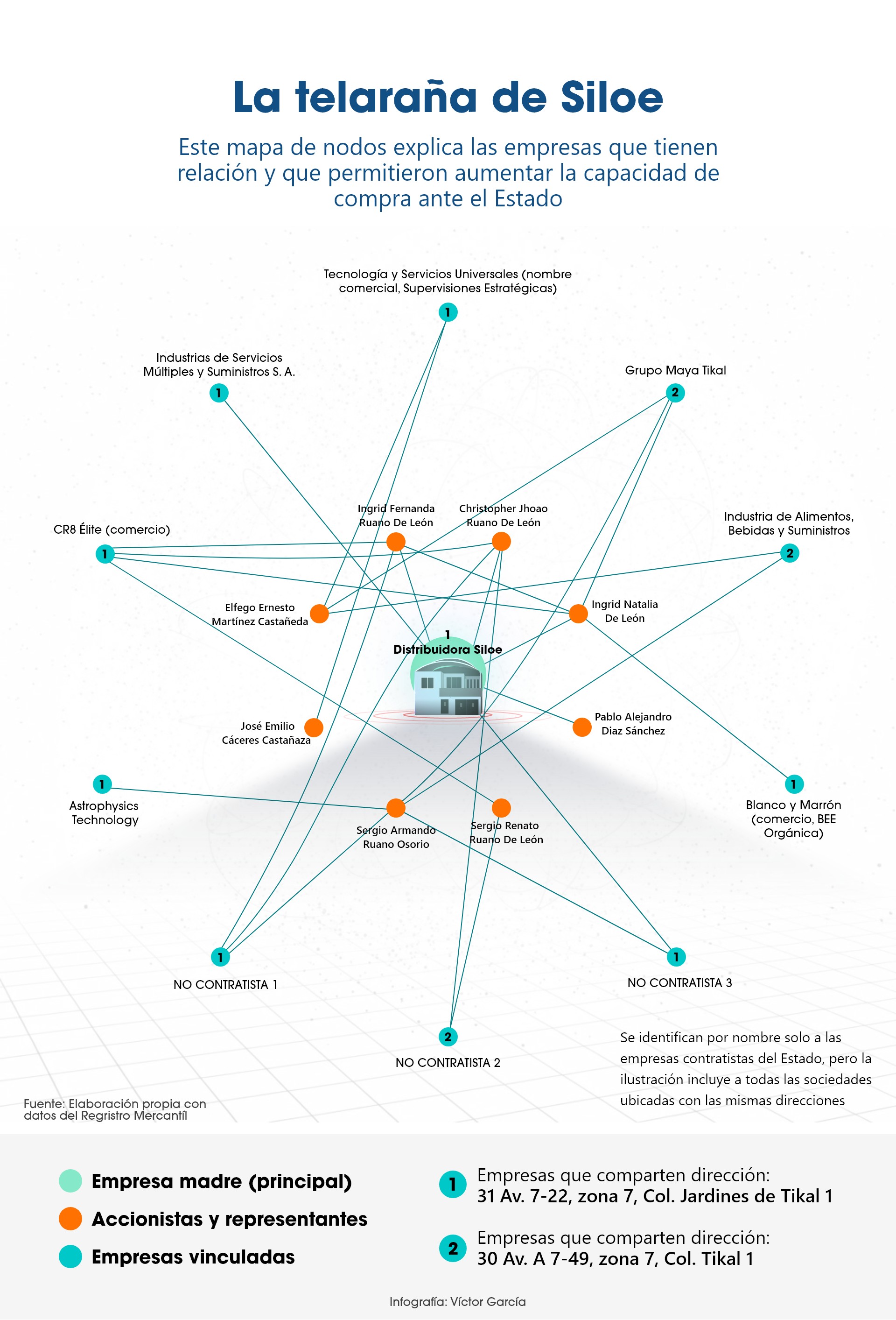 Diversas fuentes con conocimiento del tema, que han pedido no ser citadas por nombre, revelan que la red de Siloe incluye al menos 18 empresas. Este medio solo pudo comprobar con documentos oficiales del Registro Mercantil que 11 sociedades comparten accionistas fundadores o direcciones; y siete de ellas son contratistas del Estado, según registros de Guatecompras.