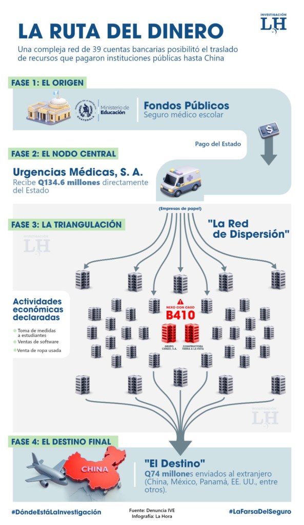 La Intendencia de Verificación Especial identifica en su denuncia un segmento que involucra 12 cuentas de siete sociedades. Los fondos salieron de una cuenta de Urgencias Médicas en la que se operaron Q134.6 millones procedentes de otra de sus cuentas que recibía fondos de instituciones del Estado. Estos pagos fueron por “servicios de asistencia de gastos médicos y funerarios… relacionados con la póliza a nombre del Ministerio de Educación”; es decir, el Programa de Seguro Médico Escolar.