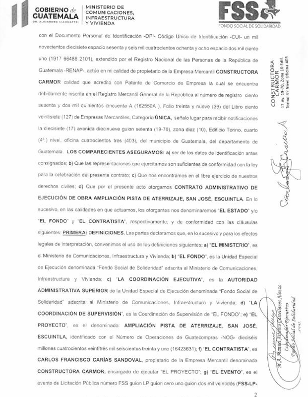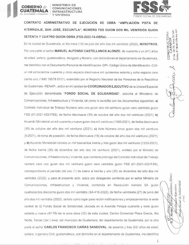 Carías Sandoval en el «Contrato Administrativo de Ejecución de la Obra Ampliación Pista de Aterrizaje, San José, Escuintla», se identifica como propietario de la constructora Carmor.