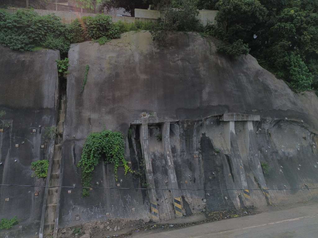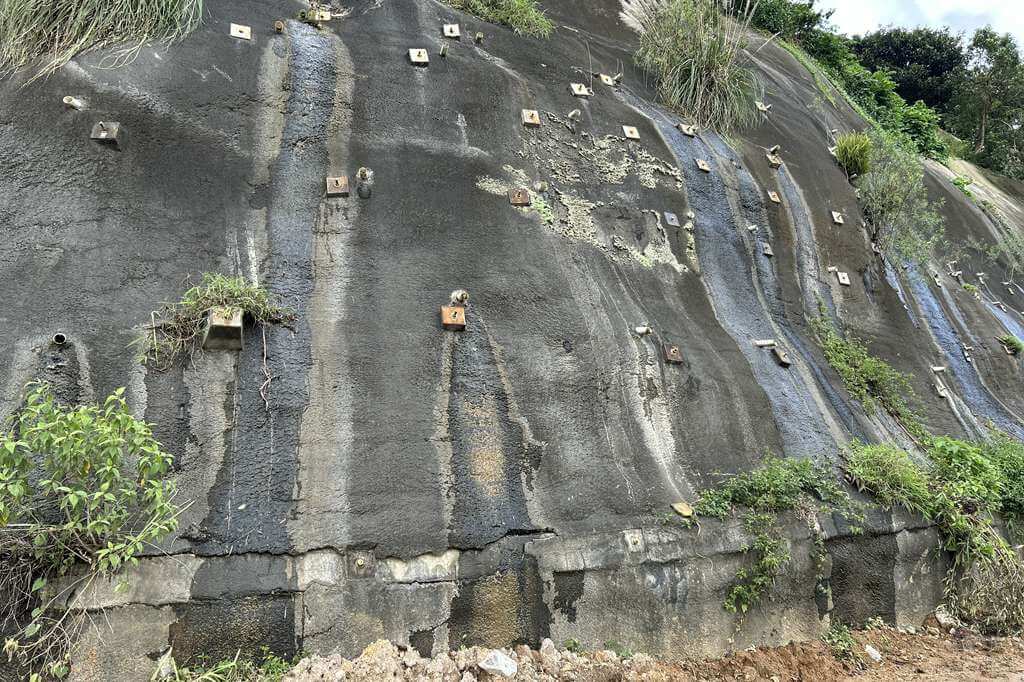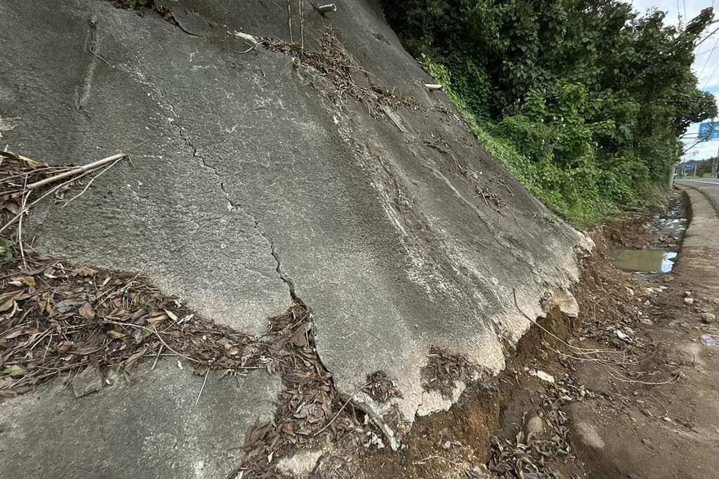 Una grieta en un muro de contención del Km 25 de la ruta a El Salvador, que evidencia, explica Conred, que un derrumbe podría ocurrir en poco tiempo. Foto: La Hora / José Orozco.