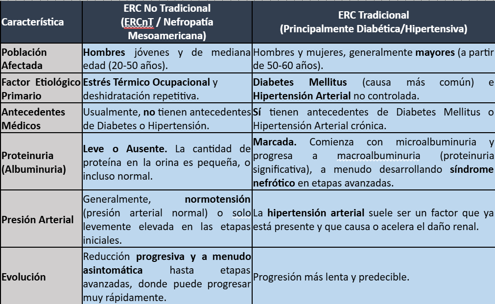 Por su aumento de incidencia y prevalencia, este es el aspecto más crítico y de gran interés para la investigación en la región. La ERC de Causas No Tradicionales (ERCnT) afecta desproporcionadamente a hombres jóvenes, trabajadores agrícolas (especialmente en la zafra de caña de azúcar, también en otros cultivos, construcción y minería) y ocurre en ausencia de diabetes, hipertensión u otras causas conocidas.
