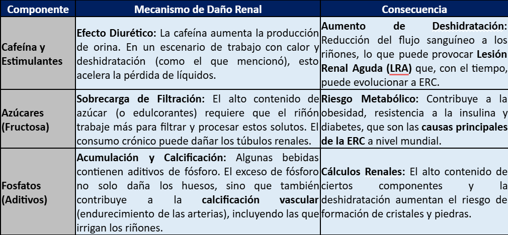 En resumen: el uso de bebidas energizantes es un punto de conexión crucial y científicamente validado, especialmente en el contexto de los trabajadores expuestos a altas temperaturas (como los trabajadores agrícolas en la Nefropatía Mesoamericana).