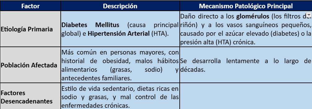 - Diabetes Mellitus (DM): Es una de las principales causas de ERC. Su creciente prevalencia en la población guatemalteca se traduce en más casos de nefropatía diabética.