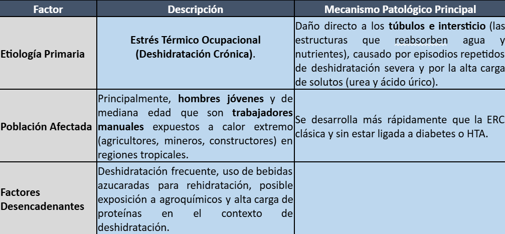 - Estrés por Calor y Deshidratación Repetitiva: La exposición crónica a altas temperaturas y el trabajo físico extenuante sin rehidratación adecuada causan Lesiones Renales Agudas (LRA) repetitivas. Se cree que la acumulación de estas lesiones a lo largo del tiempo conduce a la ERC.