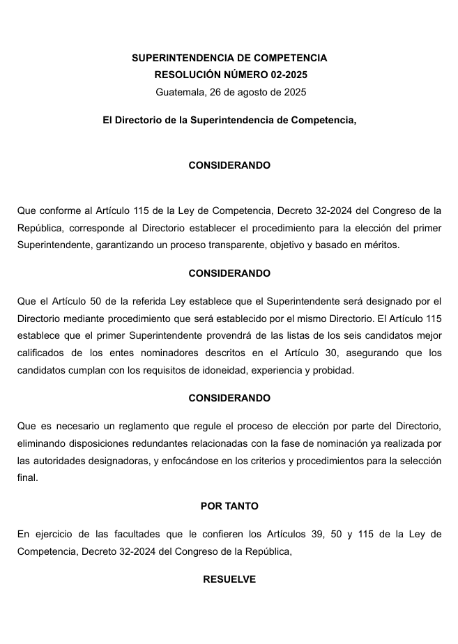 Luego de la designación de Bauer como presidente del Directorio, esta autoridad aprobó el Reglamento para elegir al primer Superintendente de Competencia con la Resolución 2-2025.