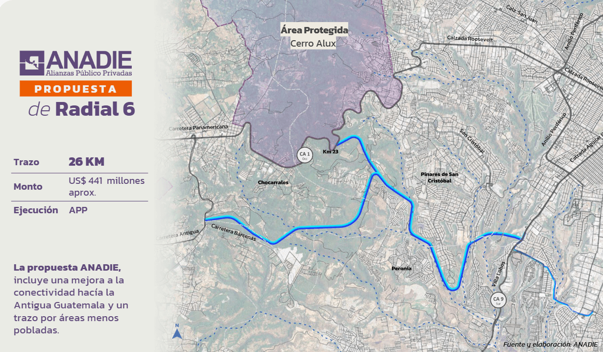 Radial 6: es una propuesta de ANADIE para comunicar la ruta hacia Antigua Guatemala desde San Cristóbal, Mixco. Son 26 kilómetros que tendrán un costo de US$441 y sería ejecutado con una APP.