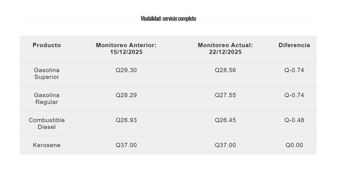 Los datos de la Dirección General de Hidrocarburos del MEM registran que en las estaciones de servicio para la venta al público en el área metropolitana, al 22 de diciembre, el galón de gasolina superior se cotizaba entre Q27.51 el autoservicio y Q28.56 el galón en las bombas con servicio completo.