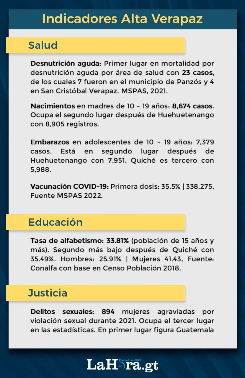 Algunos datos recientes confirman este panorama: Alta Verapaz es el departamento con menor cobertura eléctrica en todo el país; en 2021 ocupó el primer lugar de mortalidad en niños por desnutrición aguda con 23 casos; ocupa el segundo lugar en embarazos en adolescentes de 10 a 19 años, así como de nacimientos en madres de ese mismo rango de edad y de las tasas más bajas de vacunación contra el COVID-19, entre otros.