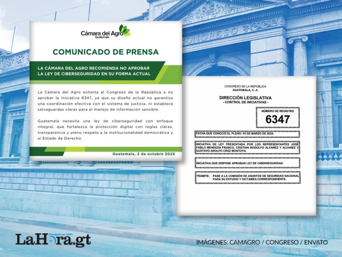 La Cámara del Agro de Guatemala expresó este jueves su rechazo, a través de un comunicado a la intención del Congreso de aprobar la Iniciativa 6347, conocida como Ley de Ciberseguridad, en la forma en que está planteada actualmente.
