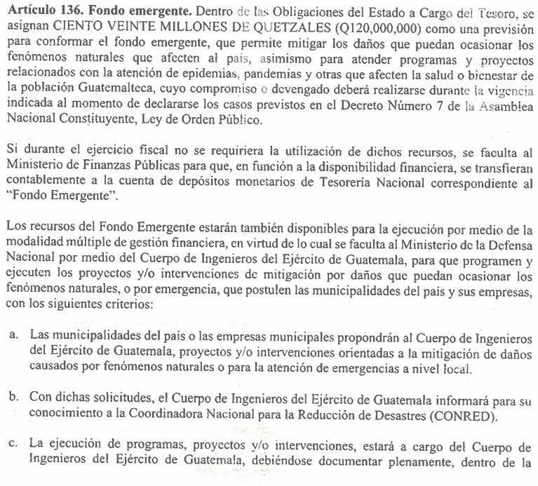 El artículo 136 de esta la ley establece la creación de un fondo emergente de Q120 millones, destinado a responder de manera inmediata ante fenómenos naturales, epidemias, pandemias u otras emergencias que afecten a la población.
