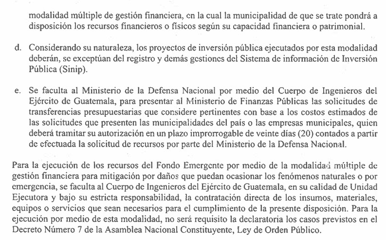 Una de las disposiciones más relevantes de este artículo es que los recursos podrán ejecutarse mediante la llamada “modalidad múltiple de gestión financiera”, que brinda un papel central al Cuerpo de Ingenieros del Ejército de Guatemala.