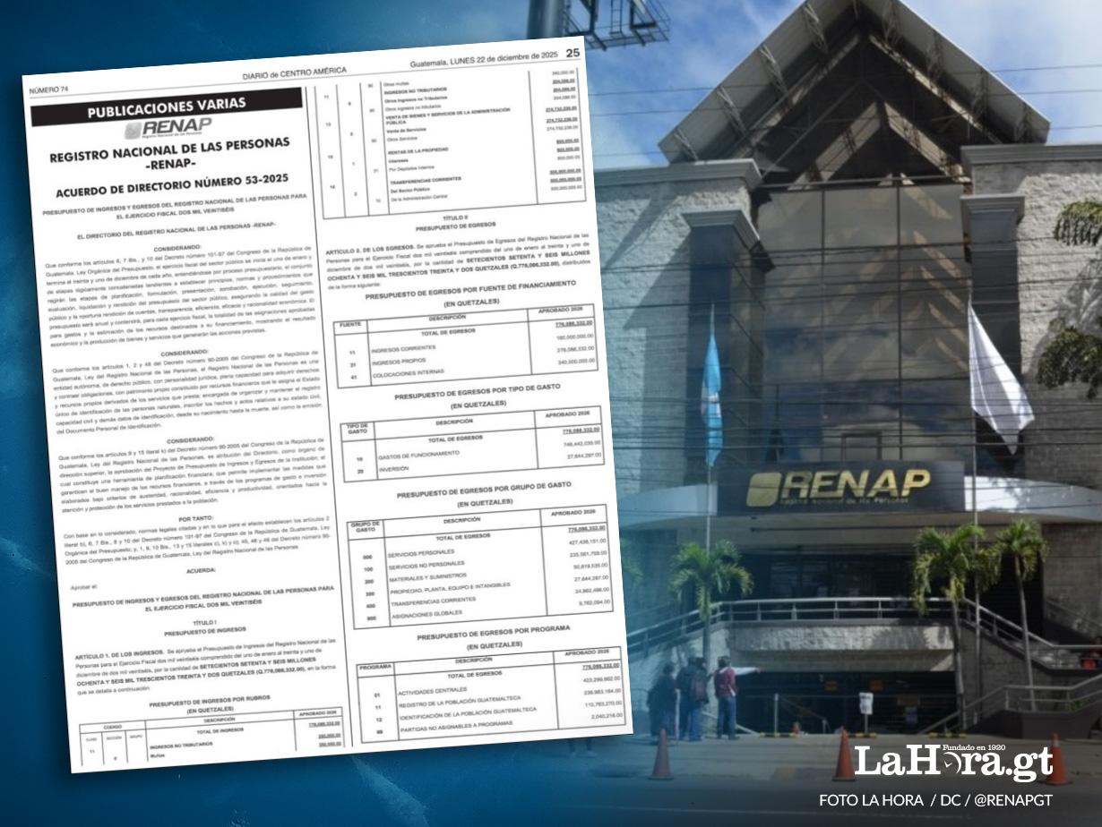 El Registro Nacional de las Personas (Renap) publicó este lunes 22 de diciembre en el Diario Oficial el monto de una ampliación a su presupuesto para este 2025, así como el Presupuesto General de Ingresos y Egresos para el ejercicio fiscal 2026.