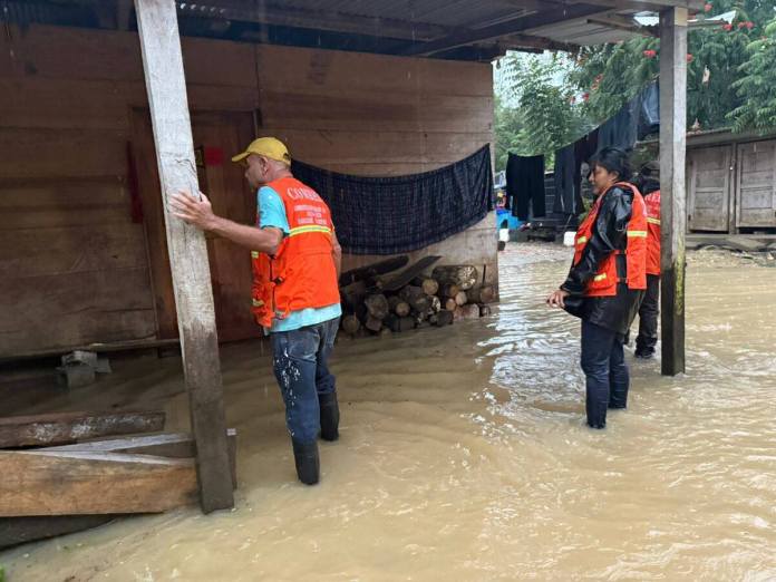 Posteriormente, brindaron asistencia humanitaria a los afectados. En las imágenes se observa que el agua subió de manera considerable, cubriendo casi la totalidad de las piernas de las personas que trabajaron en las evaluaciones de los daños en las viviendas.