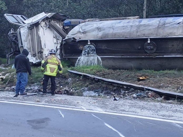 Un camión cisterna que transportaba combustible volcó esté miércoles en el kilómetro 104 de la ruta Interamericana, en jurisdicción de Agua Escondida, en Chichicastenango, departamento de Quiché.