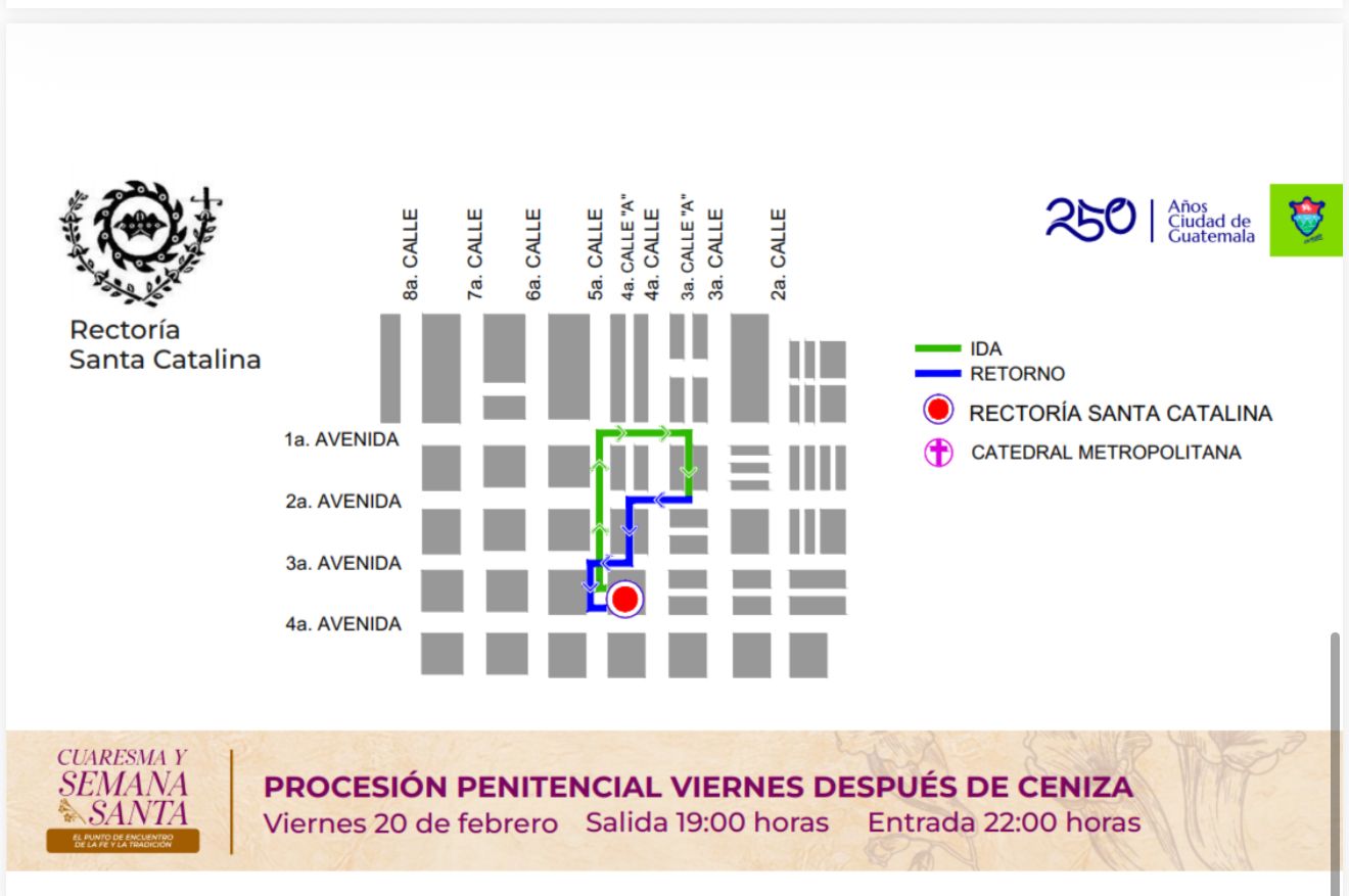 Montejo indicó que para este primer viernes de Cuaresma, a partir de las 19:00 horas, se desarrollará la procesión de la rectoría Santa Catalina en el perímetro comprendido entre la 3a. y 1a. avenida y de la 5a. a la 3a. calle de la zona 1.