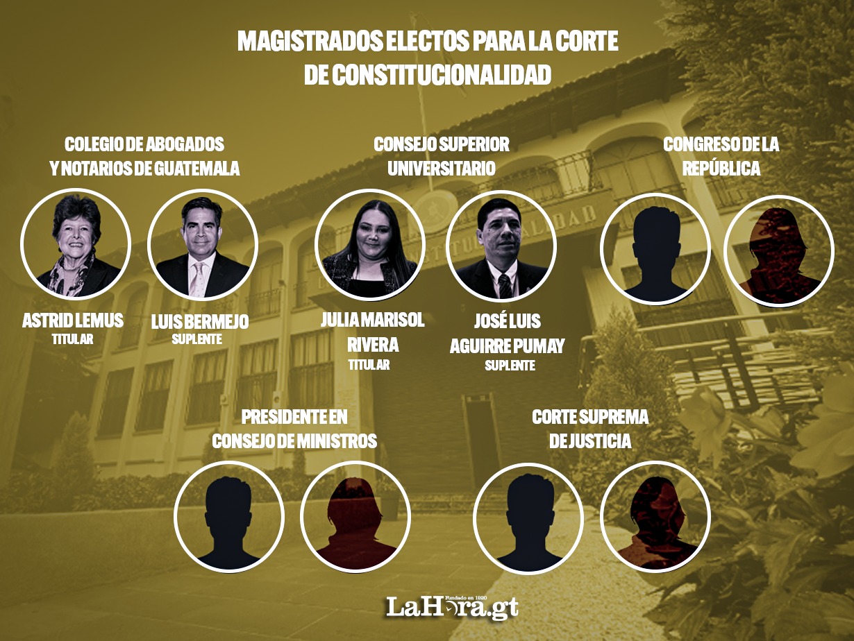 Astrid Lemus y Luis Bermejo fueron los primeros magistrados confirmados para este cargo, titular y suplente respectivamente, electos por la asamblea del Colegio de Abogados. A ellos se les sumó Julia Marisol Rivera y José Luis Aguirre Pumay, quienes representan a la academia y la universidad estatal.