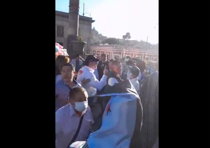 Sin embargo, los encapuchados logran sacar a Arzú García-Granados del parque central de Xela, mientras le reclaman que se retire del lugar y que se “vaya a la municipalidad, ahí sí lo reciben”.