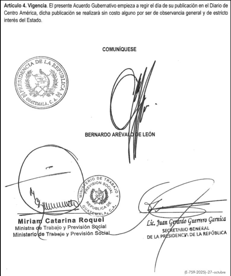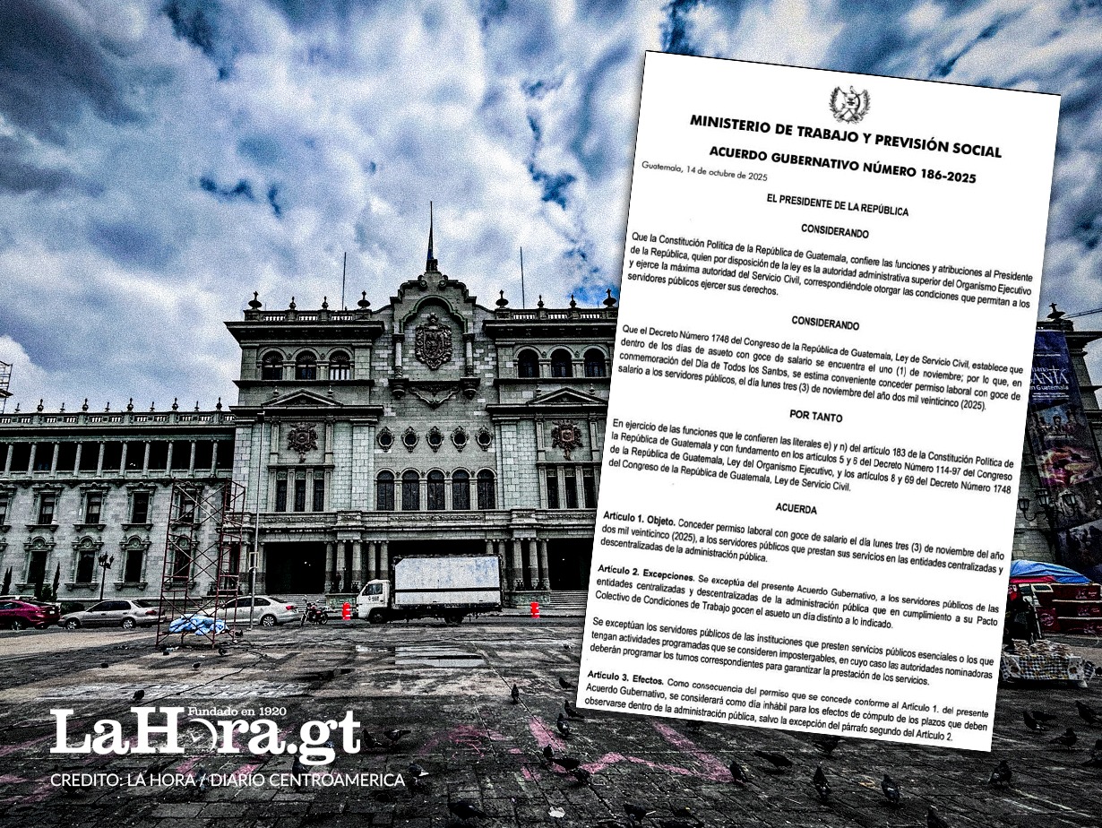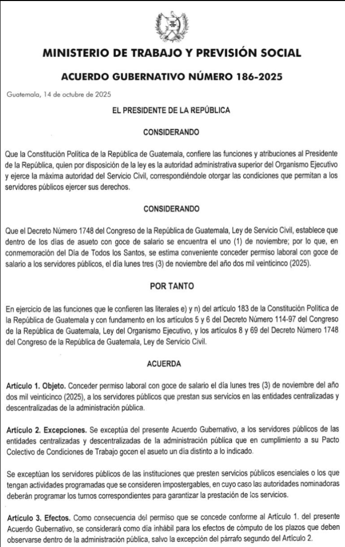 El presidente de la República, Bernardo Arévalo, aprobó el Acuerdo Gubernativo número 186-2025, mediante el cual se concede asueto laboral con goce de salario el lunes 3 de noviembre de 2025 a los trabajadores públicos que laboran en entidades centralizadas y descentralizadas del Estado.